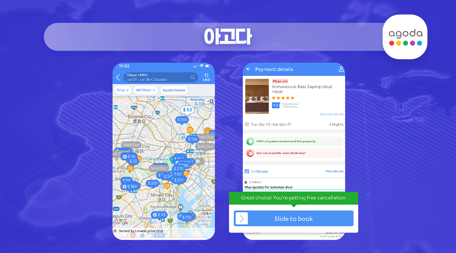 아고다는 세계 250만 개 숙소에 취급하는 숙소 예약 앱이에요. 1,500만 건이 넘는 숙박객 후기로 그 유명세를 알 수 있죠. 또, 저렴한 가격으로 널리 알려져 있어요.