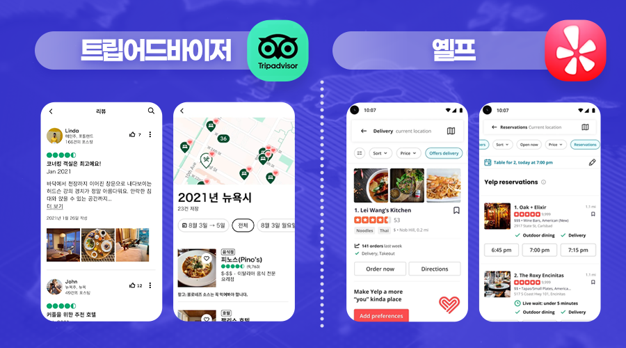 여행에서 빼놓을 수 없는 게 맛있는 음식이죠! 맛집 투어를 즐기고 싶은데 어딜 가야 할지 모르겠다면? 트립어드바이저와 옐프를 주목하세요.
