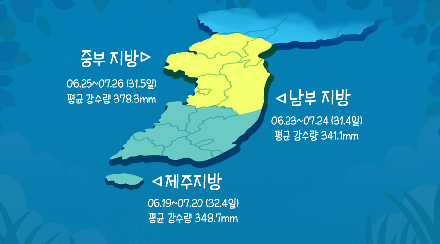 6월 23일 시작으로 7월 24일까지 31.4일간 계속되며 강수일수는 평균 17일이에요.
