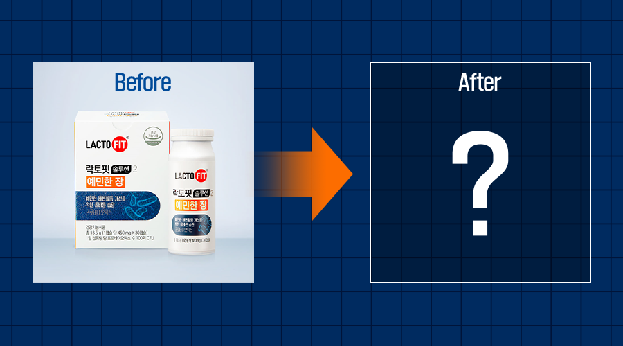 최종적으로 락토핏솔루션 제품 가운데 예민한 장을 위한 유산균인 <락토핏 솔루션2> 제품 사진 촬영을 진행하게 되었는데요. 제품은 강조되지만 키컬러가 묻혀 아쉬웠던 기존 촬영컷! 이루다마케팅의 솔루션을 받고 어떻게 바뀌었을까요?👀