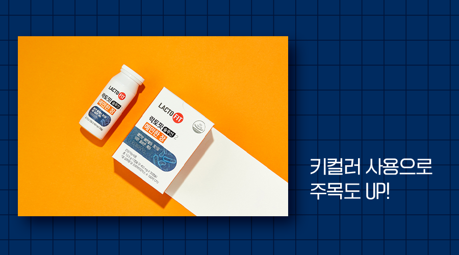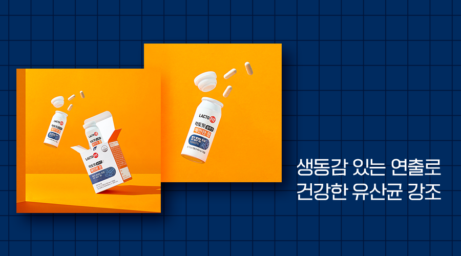 종근당건강 <락토핏 솔루션2 - 예민한 장> 라인의 키컬러인 오렌지색 배경을 사용해 제품에 대한 주목도를 높였고요. 자칫 단조로워 보일 수 있는 단색 배경에 화이트 띠지로 포인트를 주어 촬영컷에 입체감을 주었습니다.