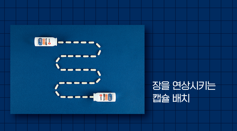 마지막 제품 사진 촬영은 '장을 연상시키는 캡슐 배치'로 제품의 특장점인 장까지 살아서 가는 유산균의 힘을 강조했어요. 이때 캡슐이 잘 보이도록 배경은 제품 패키지 컬러 중 하나인 네이비 색상을 사용하여 주목도를 높였습니다.