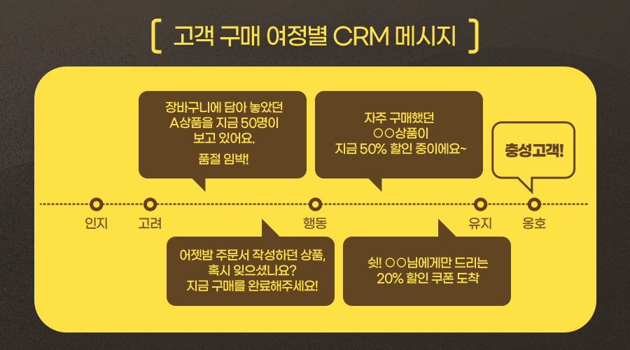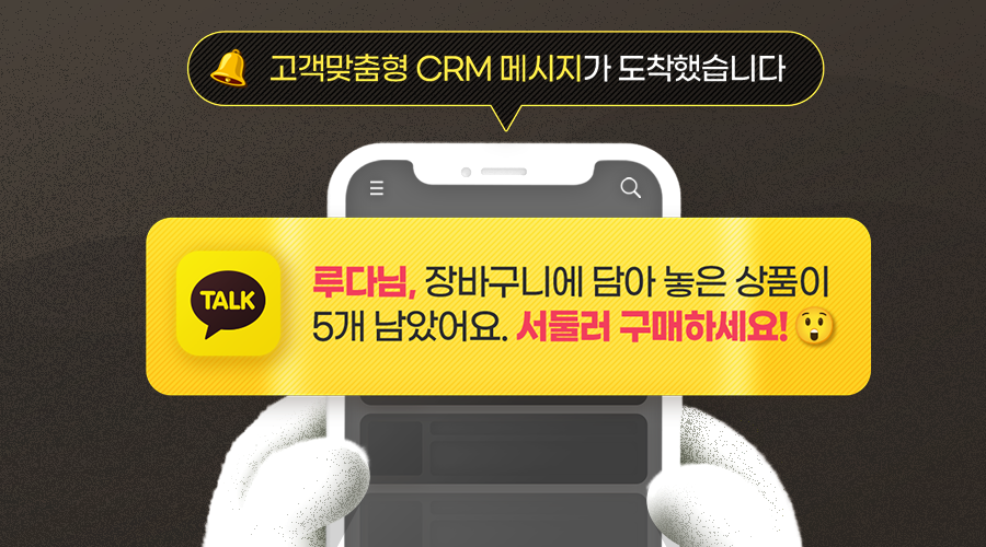장바구니 이력, 구매 이력을 토대로 고객이 선호하는 제품의 할인 정보를 알리는 메시지를 보내면 구매 확률을 높일 수 있어요. 이렇게 지속적인 고객 관리를 통해 재구매를 유도할 수 있답니다.