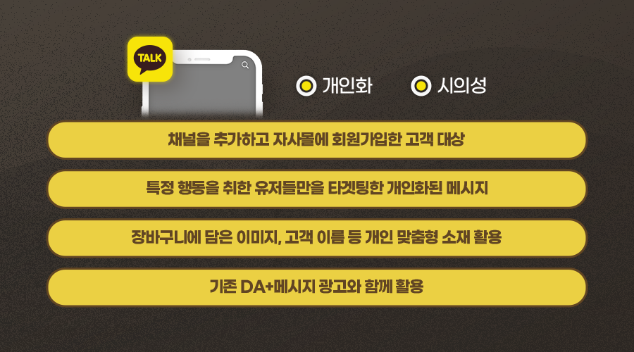 또한, 자사몰에 회원가입하고 카카오톡 채널을 추가한 고객을 대상으로 하기 때문에 더욱 확실한 구매 전환을 만들어요. 이때 장바구니에 물건을 담거나 제품 탐색 중 이탈하는 등 특정 행동을 취한 고객을 타겟팅하고, 해당 제품 이미지와 유저 이름을 넣은 맞춤형 소재로 개인화된 메시지를 보내요. 더불어, 비즈보드 같은 DA 광고나 기존의 광고성 메시지들과 함께 활용하면 시너지 효과를 낼 수 있답니다!