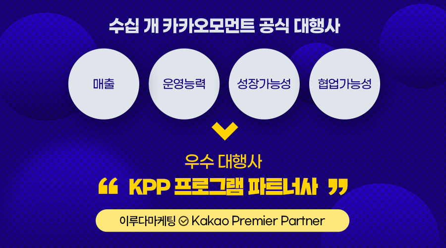 🎊경축🎊 이번에 이루다마케팅이 KPP 프로그램 파트너사로 선정됐어요. 수십 개 카카오모먼트 공식 대행사 중에서도 매출, 운영 능력, 성장 가능성, 협업 가능성 등 다방면을 고루 살펴 뛰어난 역량을 보유한 대행사에게만 KPP 자격을 부여하는데, 이루다마케팅은 브랜드의 매출의 높이는 광고 운영 능력뿐 아니라 대행사 자체로서 성장 가능성도 무궁하니 안 뽑힐 수가 없었겠죠!?