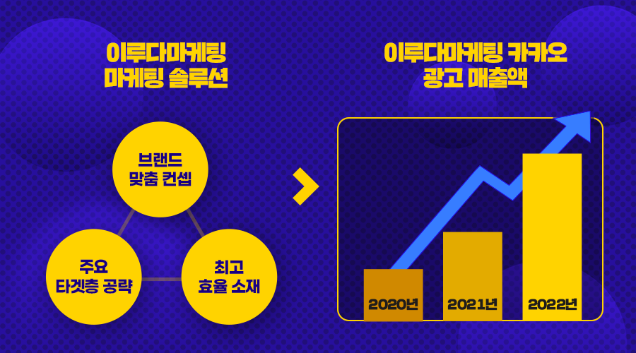 먼저 ▲고객의 니즈를 파악하고 ▲브랜드를 심층 분석해 ▲딱 맞는 컨셉과 ▲주요 타겟층을 찾아 ▲적합한 채널에서 ▲최고 효율을 보이는 소재로 광고를 운영해요. 이러니 광고 효율이 좋을 수밖에 없죠! 특히 이루다마케팅은 2015년부터 카카오 광고를 집행해 온 노하우가 있기 때문에 이루다와 함께 한 브랜드의 매출액은 하늘 높은 줄 모르고 고공행진 중이라고.🤭