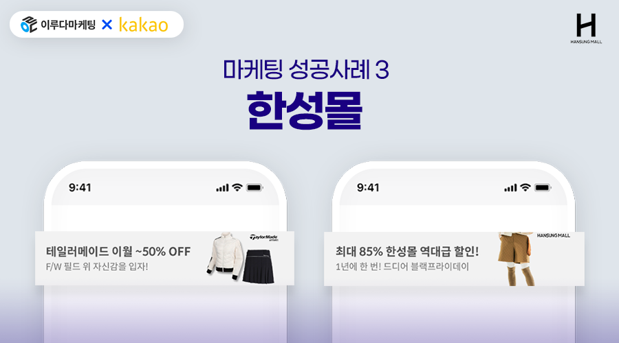 이루다마케팅은 한성몰의 주 타겟이자 골프 집중 이용층인 3050 연령을 겨냥했어요. 카카오톡 비즈보드를 통해 할인율을 강조한 소재와 블랙프라이데이라는 시즈널 이슈를 활용한 카피로 유입을 이끌어, 최고 414% 매출 증가를 이뤄냈어요.👏