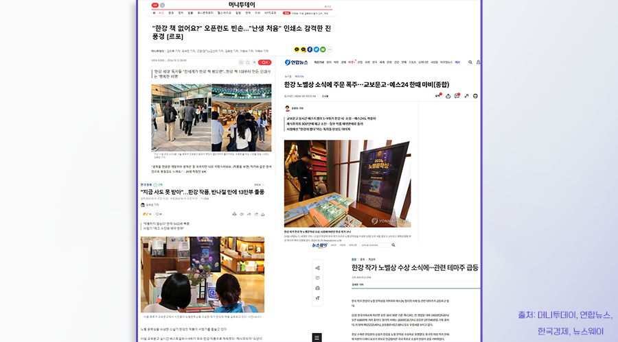 세계적인 이슈는 한강 작가의 팬이거나 문학을 좋아하는 독자를 넘어서, 작가의 이름 정도만 들어봤거나 문학에 관심이 없는 국민들도 서점으로 불러들였습니다. 여러 가지 이유가 있을 것으로 예상되는데요. 대한민국 국민으로서의 동질감, 문학 강국으로 도약할 대한민국의 흐름 예측, 지인들과 대화를 나누기 위한 사전 학습 등이 아마 그렇지 않을까 합니다.