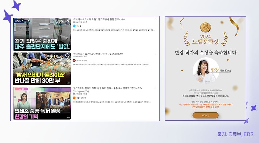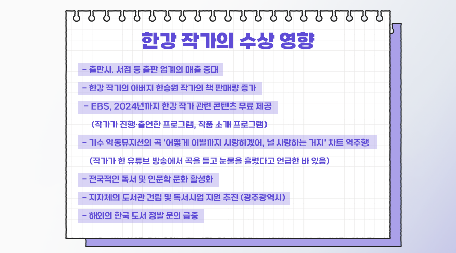 이같은 현상은 소위 인플루언서들이 다수의 사람을 자신의 업계에 유입시키는 것과 구조적으로 크게 다르지는 않습니다. 전국 혹은 세계적인 스타들은 대한민국에서 꾸준히 탄생해 왔죠. BTS‧손흥민‧봉준호 등이 한국의 K-팝과 축구, 영화 시장에 영향을 미쳤듯이, 한강 작가는 한국 문학이 세계 문학으로 진입하는 것을 공식화하고, 문학을 고급화하는 등 인문 업계에 지대한 영향을 미쳤다고 볼 수 있습니다.