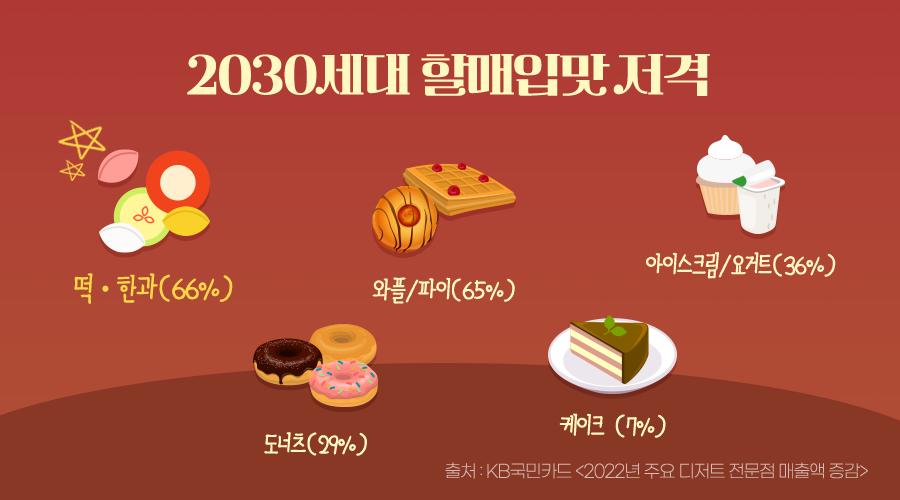 KB국민카드가 발표한 주요 디저트 전문점의 최근 4년간(19년 대비 22년) 매출액 증감 추이를 보면 떡 · 한과가 쟁쟁한 후보들을 물리치고, 66%로 가장 높은 매출액을 기록했어요. 전통간식의 재발견이 아닐 수 없는데요! 할매니얼 열풍에 힘입어 전통간식의 매출은 오프라인뿐만 아니라 온라인에서도 꾸준히 늘고 있는 추세에요📈