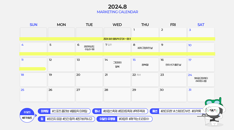 - 7월 24일 ~ 8월 10일 : 2024 파리 올림픽