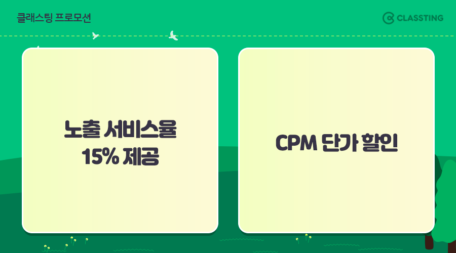 - 내용 : 6월 30일 이내에 집행되는 모든 신규/재집행 캠페인 대상 CPM 단가 할인(단독 부킹 시 CPM 30% 할인, 2개 부킹 시 CPM 50% 할인)