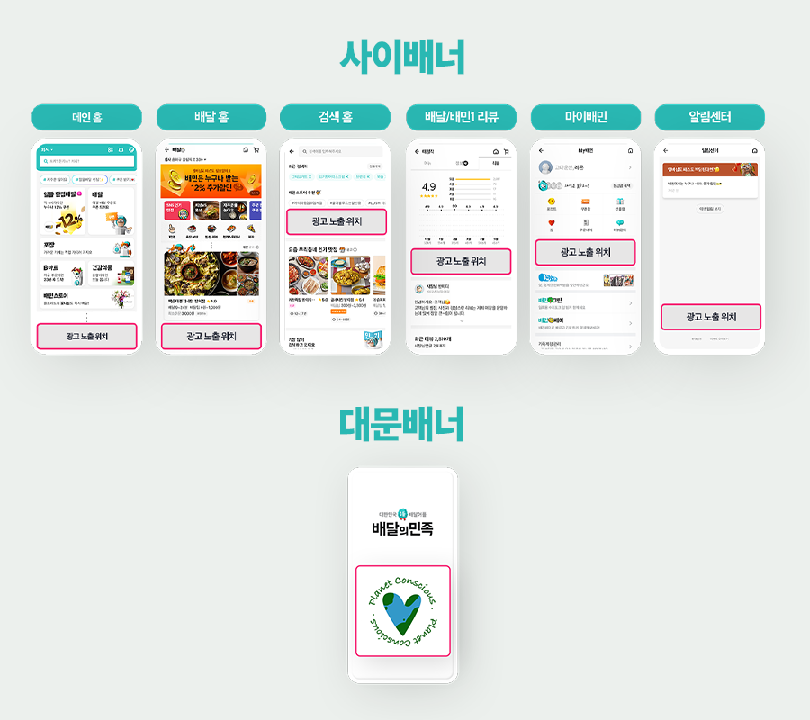 - 사이배너 : 앱 내 6개 위치(메인홈/배달홈/검색홈/리뷰/마이배민/알림센터)에 노출되는 DA배너 상품
