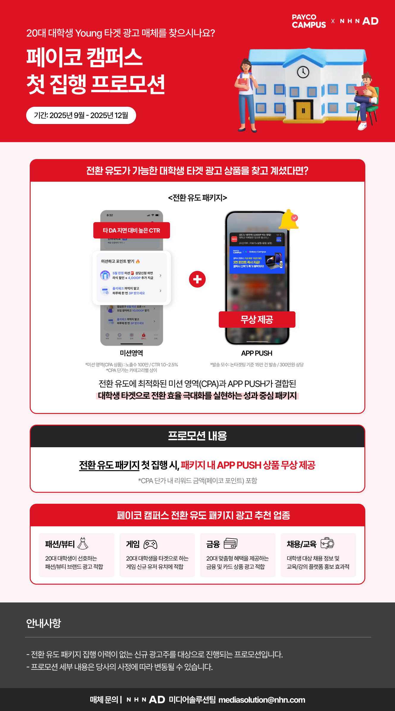 * 전환 유도 패키지 : 미션 영역과 타겟 앱 푸시를 연계하여 전환 효율 극대화를 실현하는 성과 중심 광고 패키지 상품으로 회원가입, 계좌개설, 보험료 조회 등 주요 KPI 액션 유도에 용이합니다.