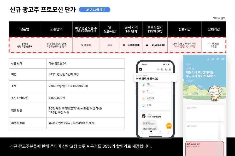 - 내용 : 고정 포스트 타입(상단 고정 슬롯A) 35% 할인 집행 (1주 400만원 → 260만원)
