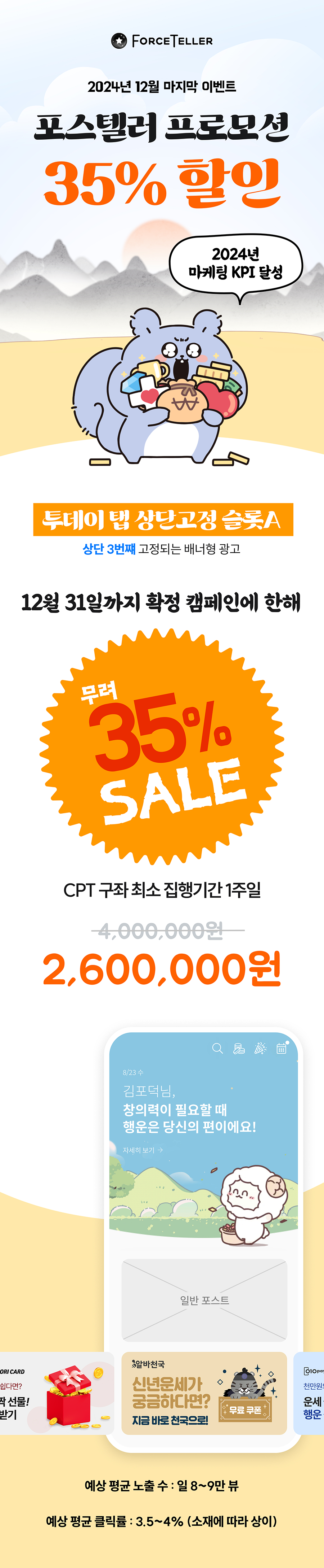 - 고정 포스트 타입(상단 고정 슬롯A) : 투데이 탭 상단 영역에 고정으로 노출되는 광고 구좌